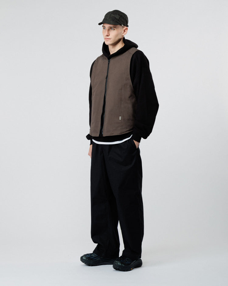 The moleskin-lined inseam pockets provide both comfort and extra warmth for cold hands, while the exterior is crafted from heavyweight BCI (Better Cotton Initiative) cotton canvas, chosen for its durability and clean, structured look. Subtle split-seam detailing gives the vest a considered finish without detracting from its minimal silhouette.