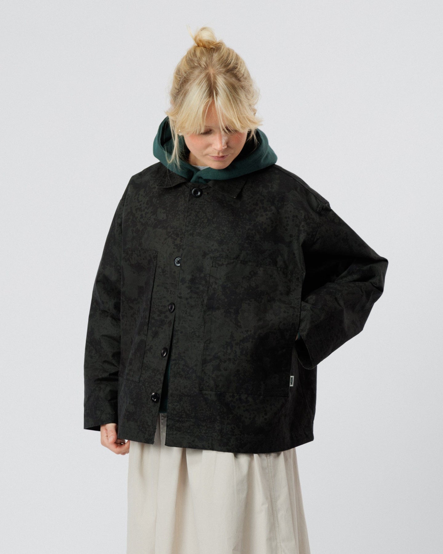 Our Limited Edition Nell Jacket combines everyday practicality with statement style. Crafted in a subtle Black Ink print on premium Scottish dry-waxed cotton canvas, the fabric evokes a textured, organic pattern reminiscent of ink dispersing through water, bringing a contemporary edge to a classic utilitarian design.