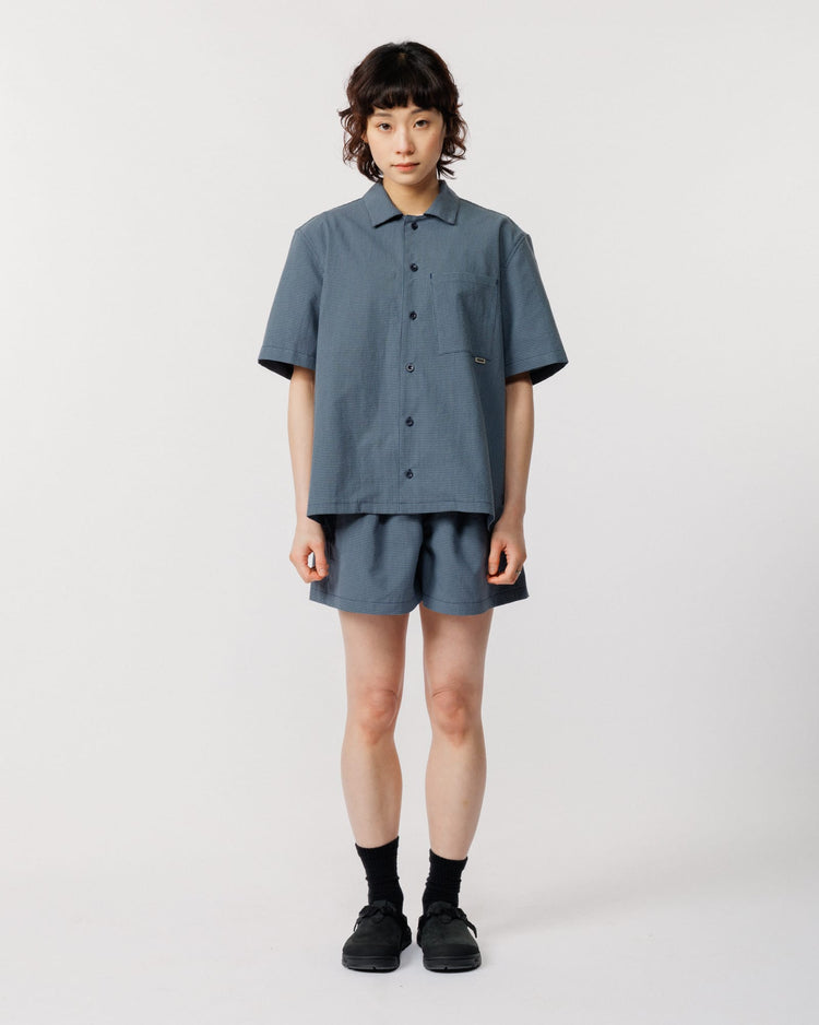 Cut from a lightweight 60% organic cotton, 40% recycled polyester checked fabric, both pieces share the same relaxed, easy fit. The Ezra comes in our signature boxy cut with a button-down collar and asymmetric chest pocket. The Patti Short features two front pleats and an elasticated drawstring waist for a fit you can dial in.