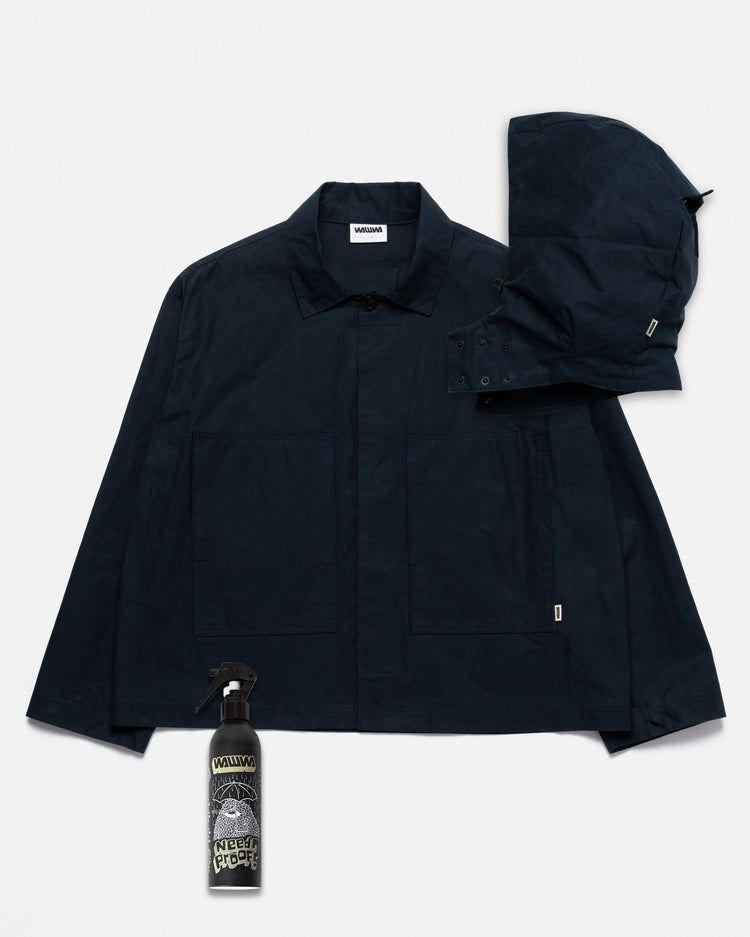 The Nell Overshirt & Hood Set in indigo blue is the ultimate WAWWA outerwear package - bringing together the versatile Nell Overshirt, its modular detachable hood, and Reproofing Spray to keep your gear performing at its best.