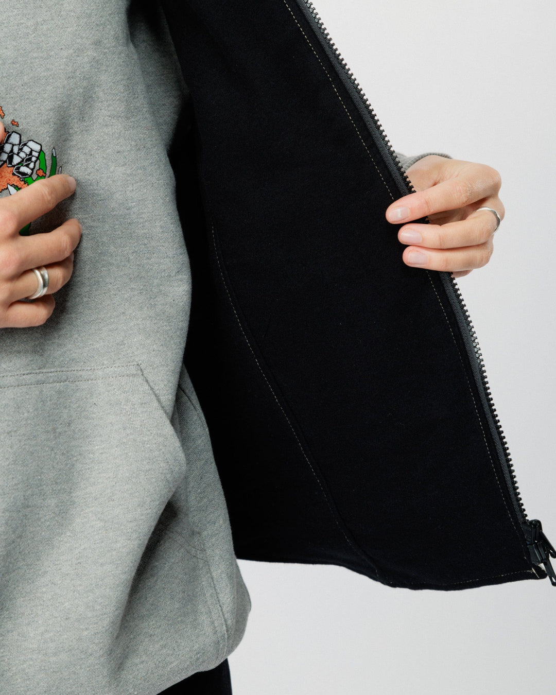 A two-way matte YKK zipper with recycled tape adds a practical, sustainable touch—allowing easy ventilation and flexibility when layering.