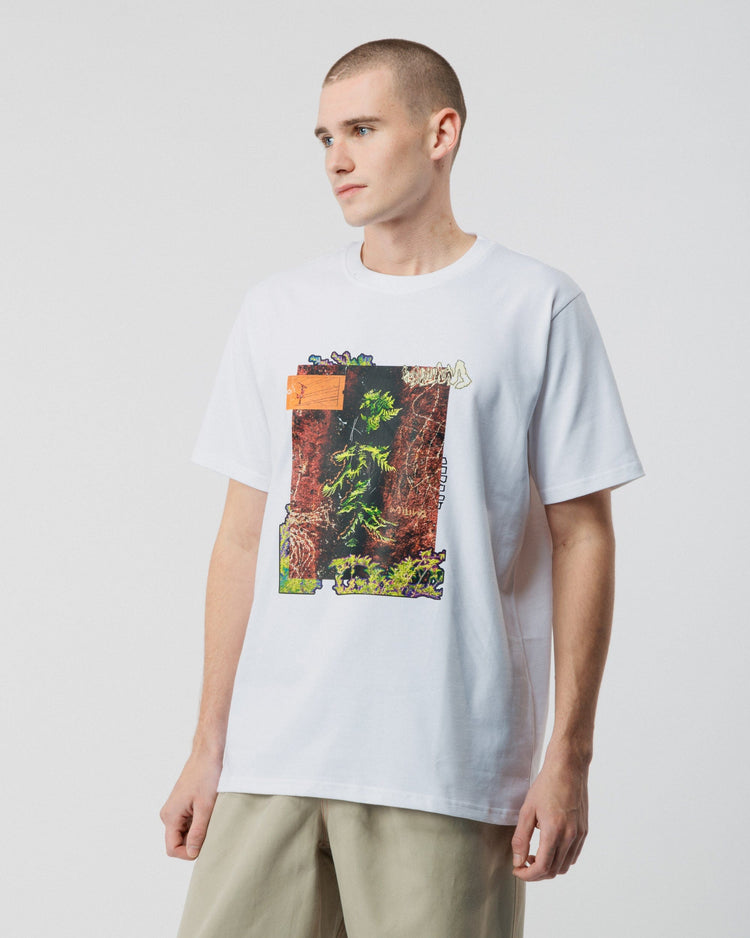 The Westing T-shirt in White celebrates the quiet resilience of the British landscape - ferns growing through stone walls in the Peak District, captured in a unique hand-drawn overlay on documentary photography. This combination of artwork and photographic detail creates a striking, textured design that brings the wild edges of the UK into your wardrobe.