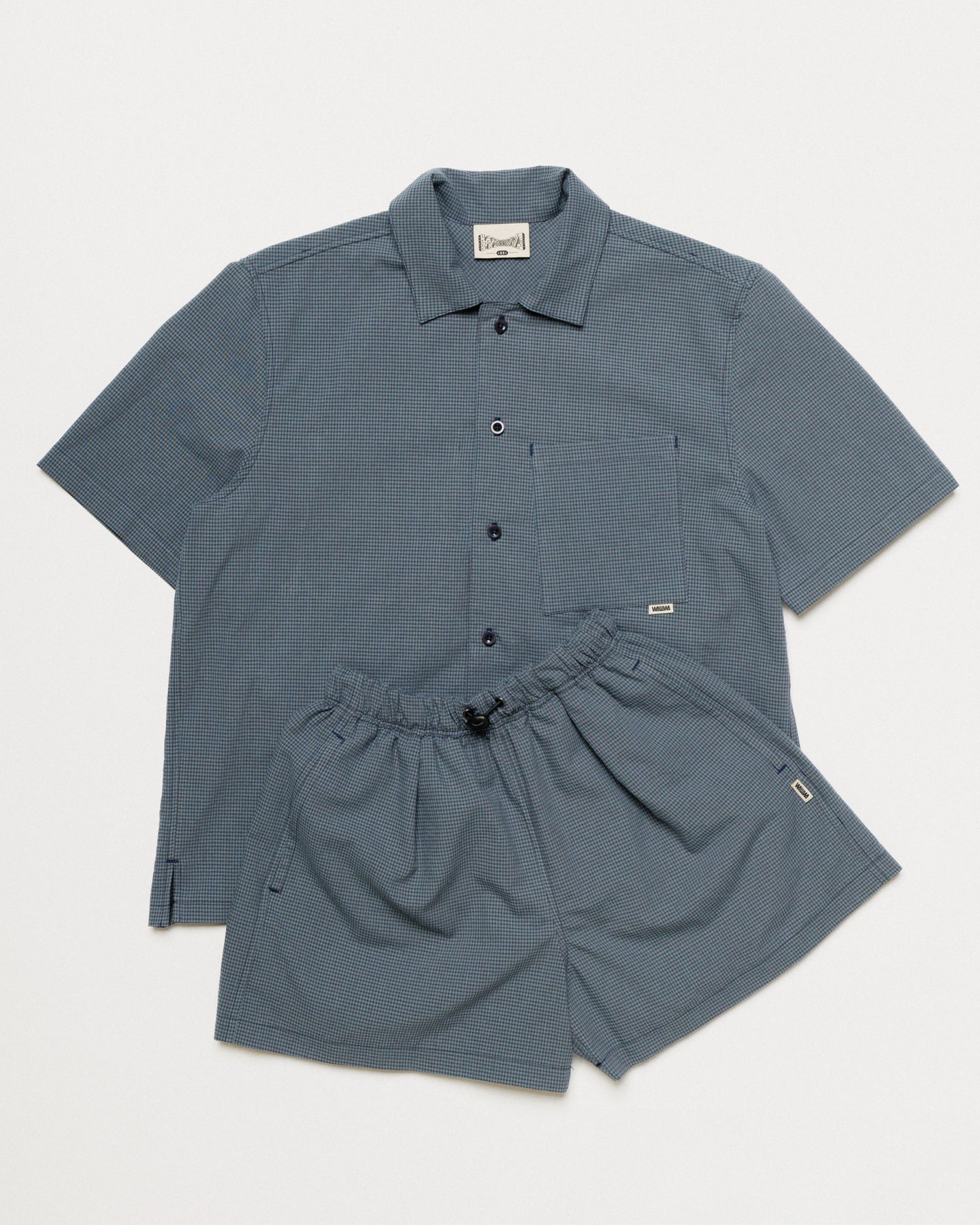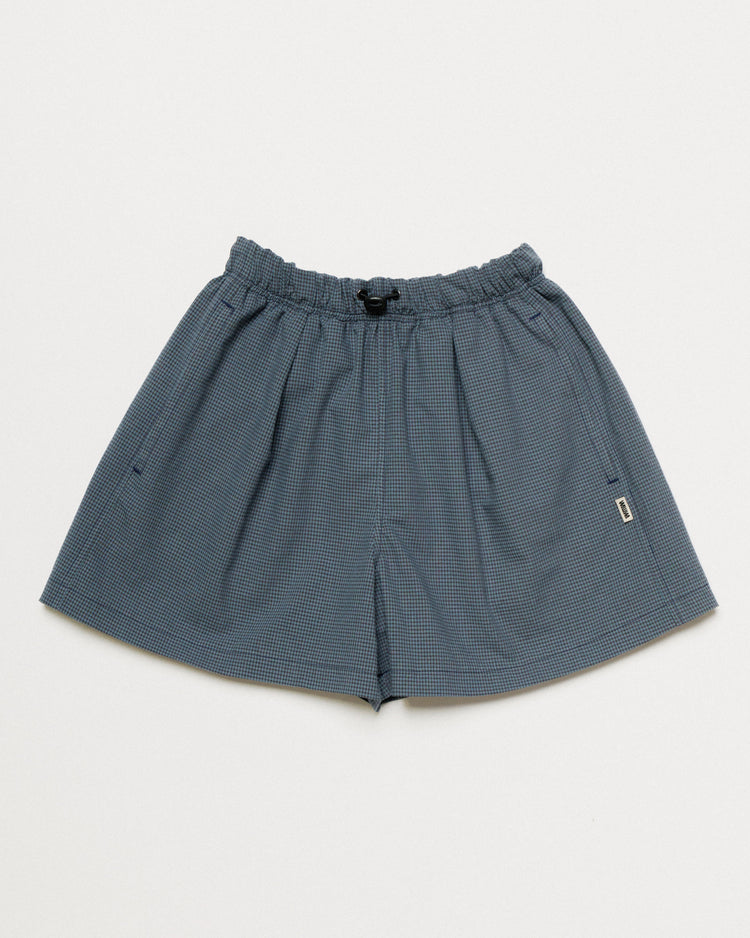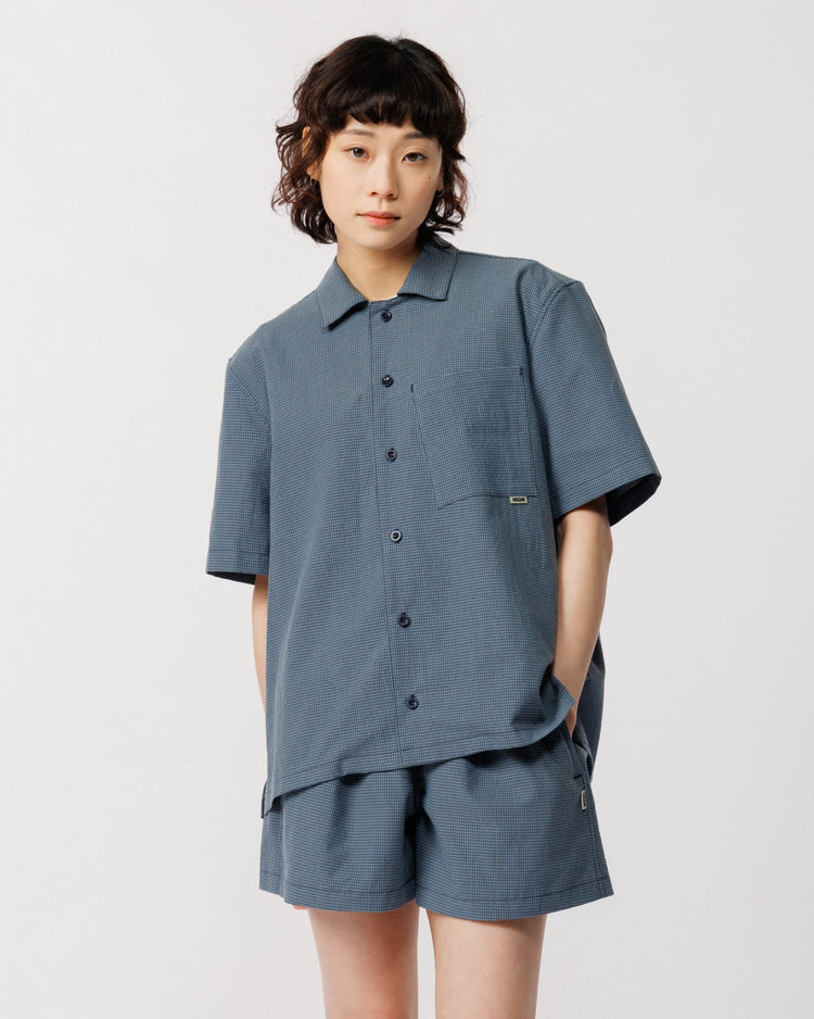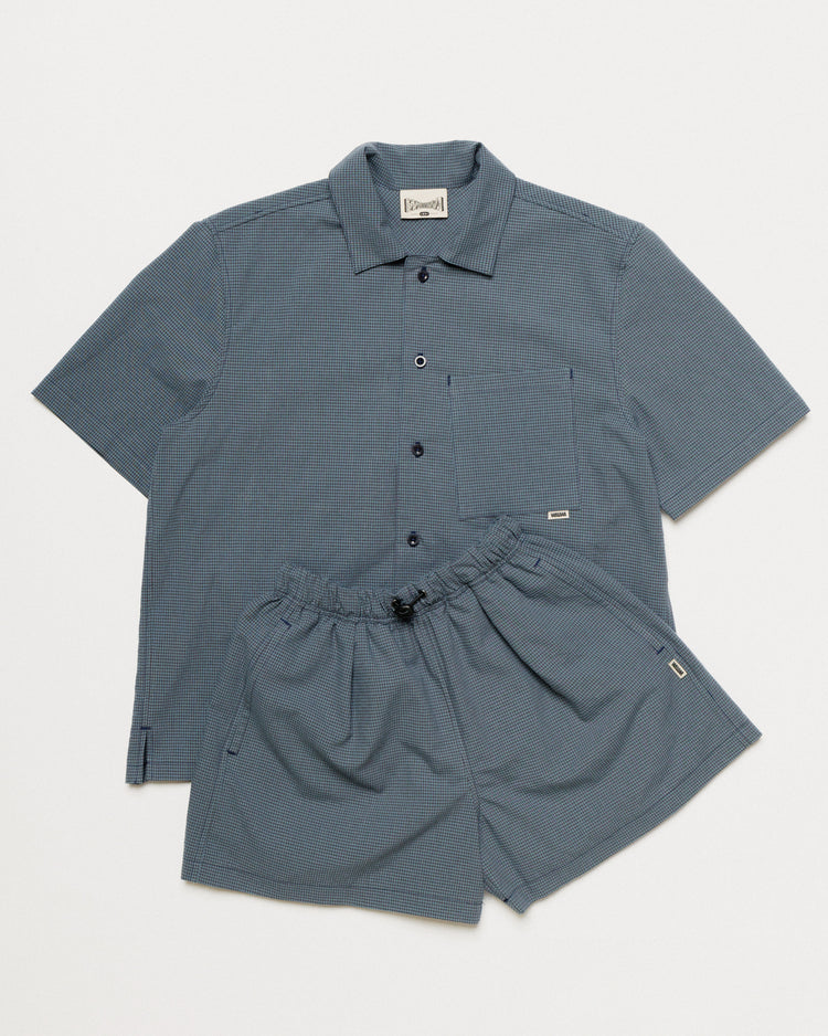 Cut from a lightweight 60% organic cotton, 40% recycled polyester checked fabric, both pieces share the same relaxed, easy fit. The Ezra comes in our signature boxy cut with a button-down collar and asymmetric chest pocket. The Patti Short features two front pleats and an elasticated drawstring waist for a fit you can dial in.