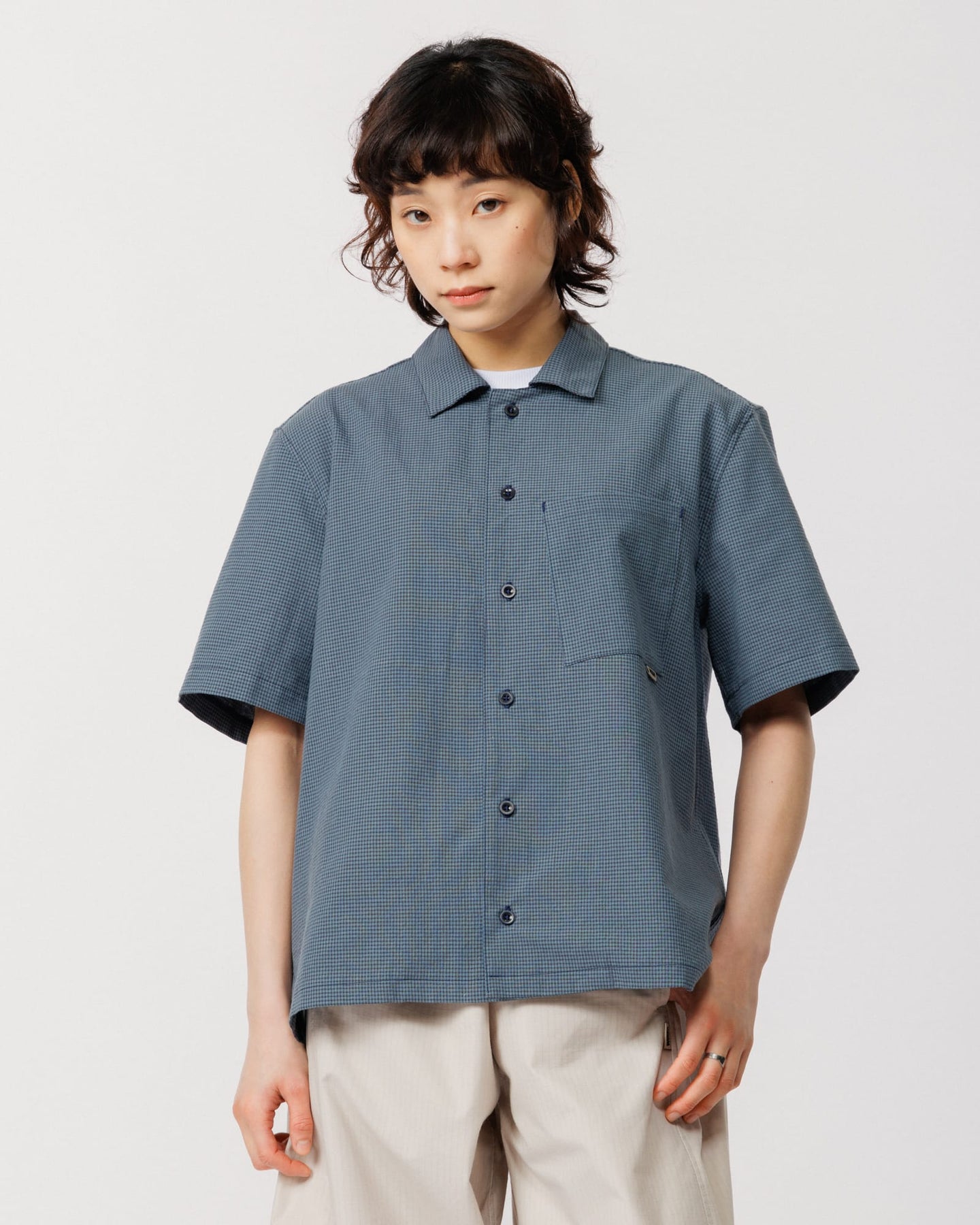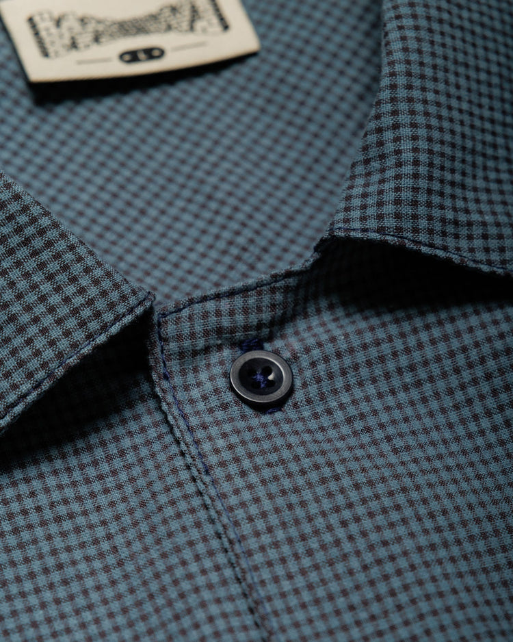 Our classic Ezra Shirt in, re-imagined in a lightweight navy/blue checked fabric for summer. Cut in our signature boxy, relaxed fit and made from a breathable organic cotton and recycled polyester blend.